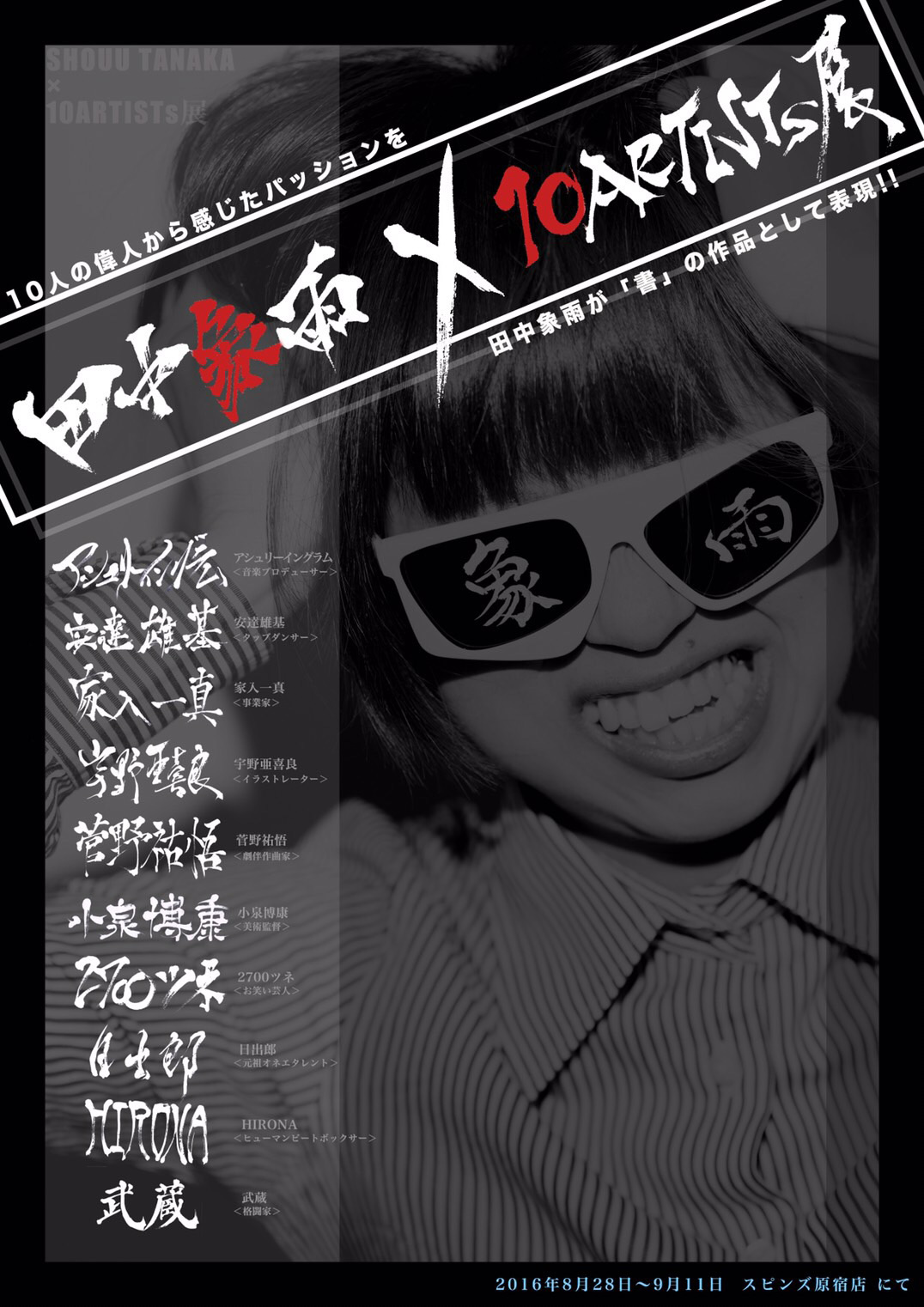 1 アシュリーイングラム(音楽プロデューサー) 2 安達雄基(タップダンサー) 3 家入一真(事業家) 4 宇野亜喜良(イラストレター) 5 菅野祐悟(劇伴作曲家) 6 小泉博康(美術監督) 7 2700ツネ(お笑い芸人) 8 日出郎(元祖オネエタレント) 9 HIRONA(ヒューマンビートボックサー) 10 武蔵(格闘家) * 50音順 【OPENING PARTY】 8月28日(日) 20:00~22:00 ゲスト:菅野祐悟 * 入場無料 【店内イベント】 9月3日(土) ゲスト:2700ツネ 9月10日(土) ゲスト:家入一真 9月11日(日) ゲスト:安達雄基、HIRONA * 入場無料 * 17:00~18:00 なお、運営費はクライドファンディングにて募っております。 書道の為に、なんか今までないおもろい事するため、皆様の ご協力なしではやり得ません。宜しくお願い致します。 https://camp-fire.jp/projects/view/9162 |
